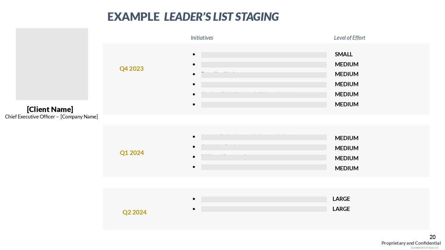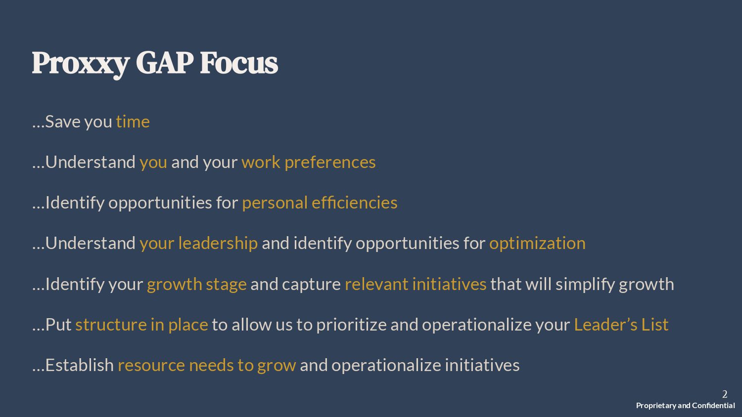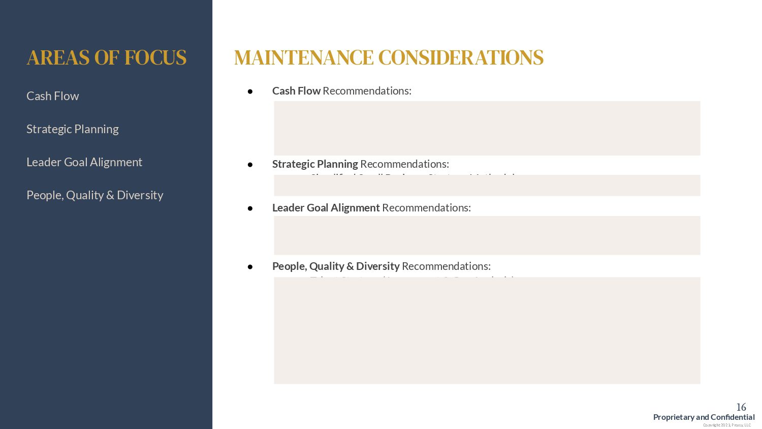For companies in the “maintain” stage, we prioritize initiatives like improving marketing strategies, optimizing operational processes, and enhancing leadership delegation. Our goal is to implement best practices that increase efficiency, streamline operations, and prepare your business for future growth or exit opportunities.